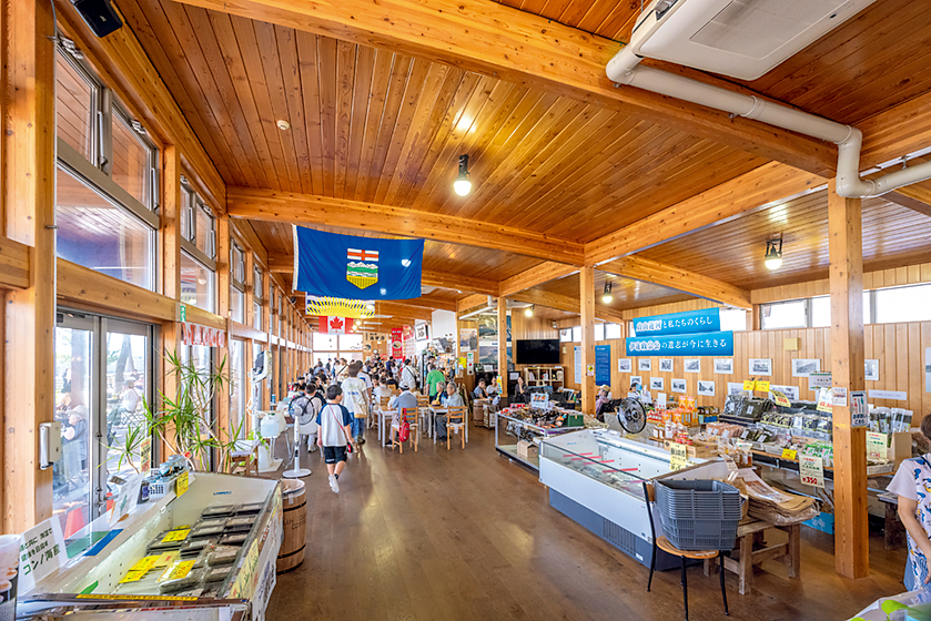 震災映像放映や復興グッズ、美味しいものが食べられる店舗が入っています