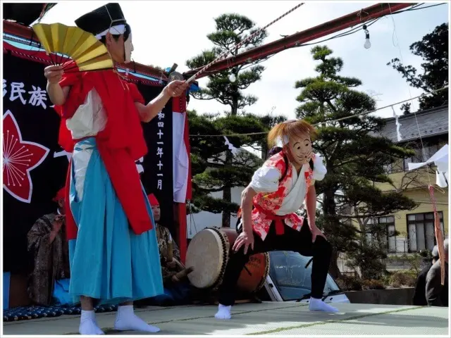 花町神楽の名前の由来は、藩主である伊達の殿様が飯野坂を通った時に沿道の桃の花にしばし見惚れてしまうことがありました。それ以来、飯野坂には見惚れるくらい美しい花が咲くということから、この地が花町と呼ばれるようになり鹿島神楽は花町神楽と呼ばれるようになりました。