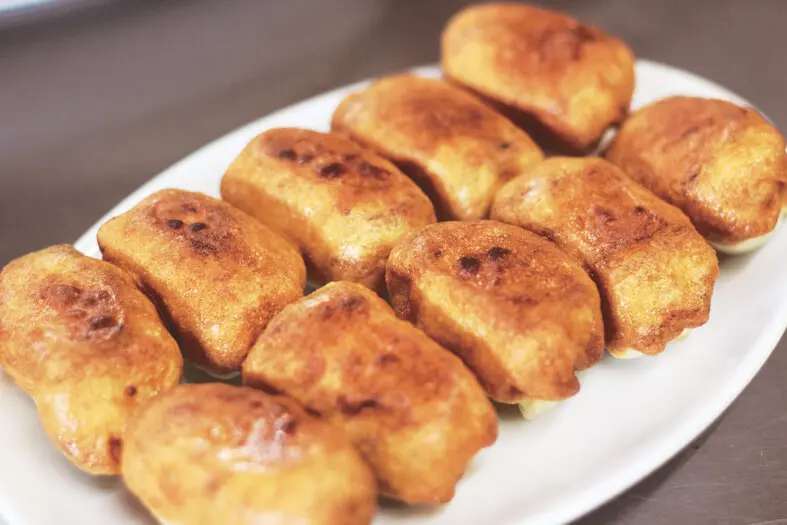 俵型でやや大きく皮が厚いのが特徴の「ホワイトギョーザ」。