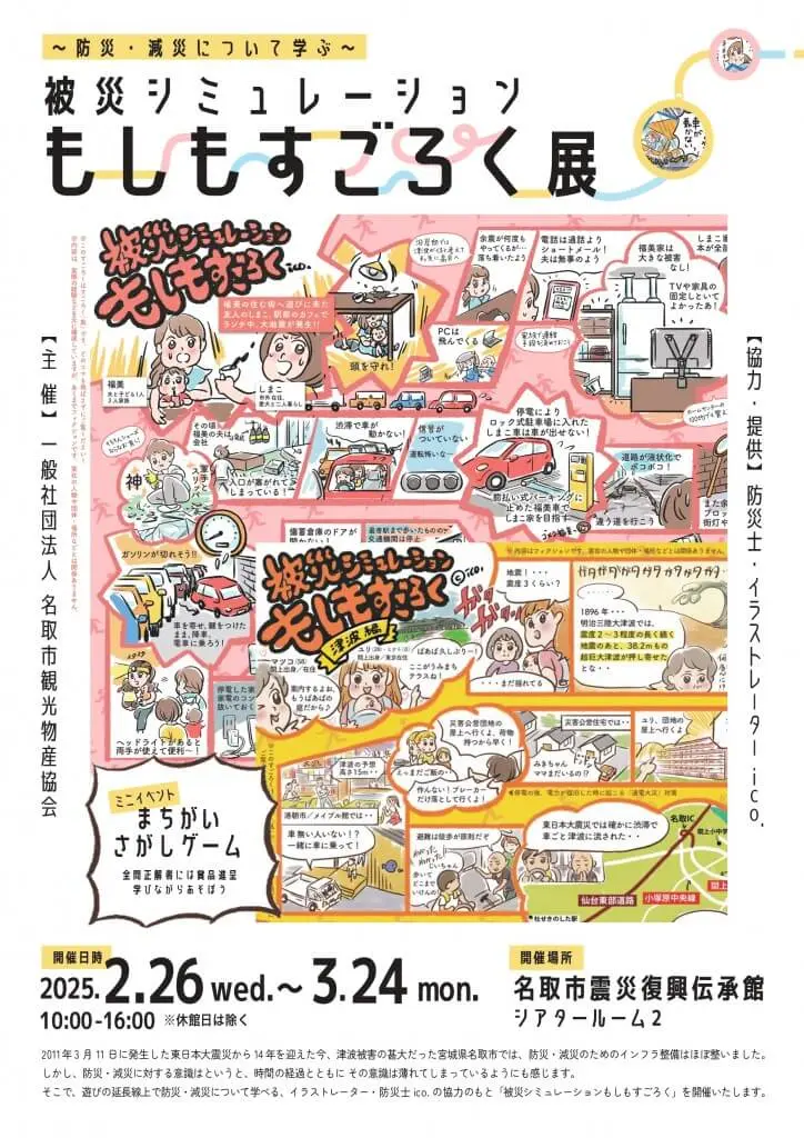 イラストレーター・防災士ico.さんの協力のもと「被災シミュレーションもしもすごろく」を