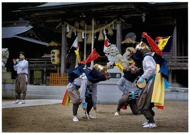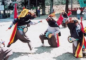 付属する熊野堂本宮社の別名・十二神から「熊野堂十二神鹿踊」と呼ばれています。 文安年間(1144年~1148年)に米沢の山伏から伝えられ氏子によって守られてきました。 江戸時代末期頃に一時中断していたものの、明治になってから再興されました。 元々「高舘十二神鹿踊」といわれ、旧仙台藩でよくみられる雅楽の鼓のひとつ・羯鼓(かっこ)を使った数名で踊るものの一種ですが、その装束と芸態はその中でも独特なものとされています。 古くから、主にお盆の頃に祖霊供養のために舞われたと言われていますが、現在では五穀豊穣を祈念しています。